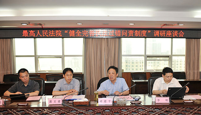 5月16日,最高人民法院“健全完善执法过错问责制度”调研组一行4人,在最高法院审判管理办公室主任周建平的带领下,来到湖北省高院进行调研座谈,省高院党组成员、副院长胡兴儒、彭方明,武汉中院、襄阳中院相关领导,以及省高院有关部门负责人等参加了座谈。